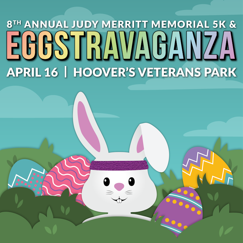 The 8th Annual Judy M. Merritt Memorial 5K & Community EGGstravaganza is back in person this year on Saturday, April 16 at 9:00 a.m. at Hoover’s Veterans Park.