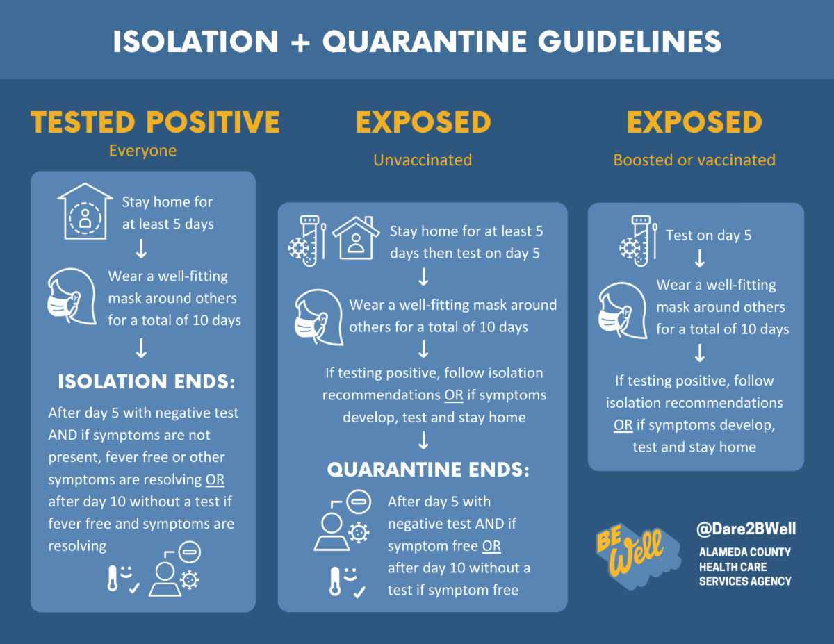 Alameda County’s isolation and quarantine orders are now aligned with the State’s guidance. The order includes 5-day isolation and quarantine for the public and is aligned with guidance for workers in health care settings and licensed residential facilities. Additional guidance for staff and residents in corrections and detention facilities and shelters is also included. Local K-12 schools and other youth settings should continue to follow the CDPH’s isolation and quarantine guidance for those settings. As a reminder, businesses governed by Cal/OSHA’s COVID-19 Prevention Emergency Temporary Standards should review their guidance for workplace settings.