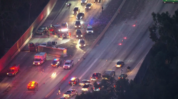 Multiple lanes are blocked on Interstate 605 in Whittier after an overturned dump truck spills dirt onto the road. Both northbound and southbound lanes at Whittier Blvd are impacted by the spill.