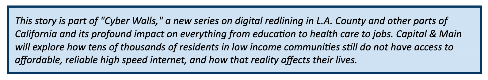 Charter Spectrum spokesman Dennis Johnson didn’t respond to Capital & Main’s emailed questions about whether it sees the county’s initiative as competition. However, the company’s Securities and Exchange Commission annual report to shareholders counted municipalities as potential competitors, noting, “Numerous local governments are also considering or actively pursuing publicly subsidized Wi-Fi internet access networks.”