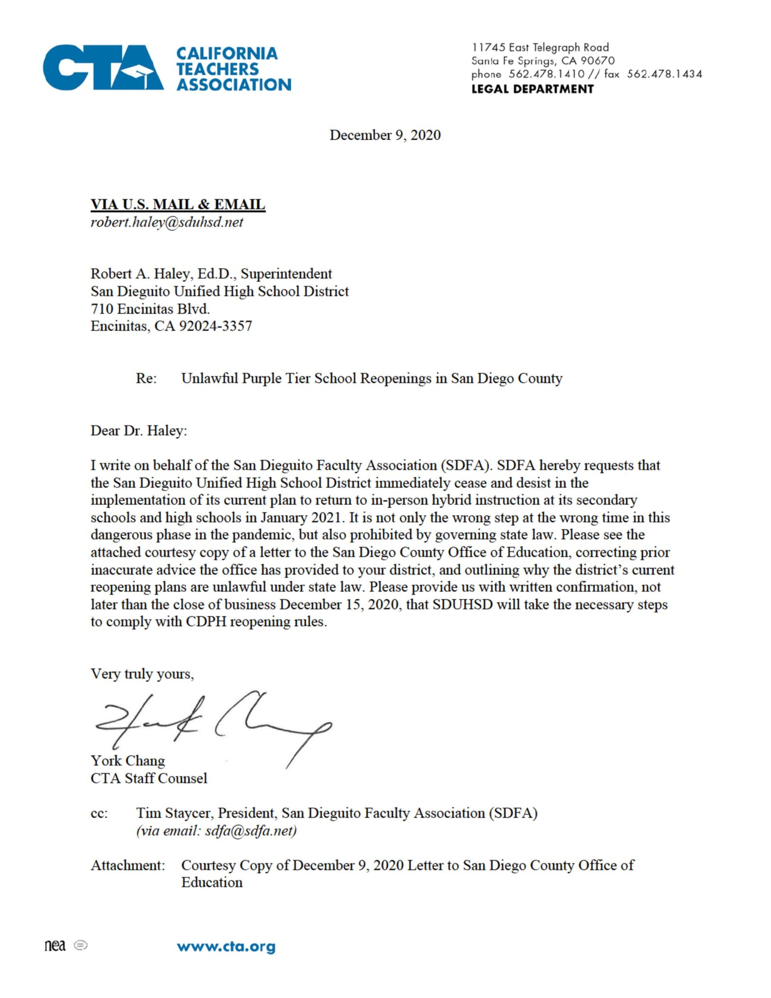 York Chang, a staff counsel for the California Teachers Association, wrote a letter on Dec. 9 on behalf of the San Dieguito Faculty Association demanding that the district “immediately cease and desist in the implementation of its current plan to return to in-person hybrid instruction at its secondary schools and high schools in January” contending “it is not only the wrong step at the wrong time in this dangerous pandemic.”