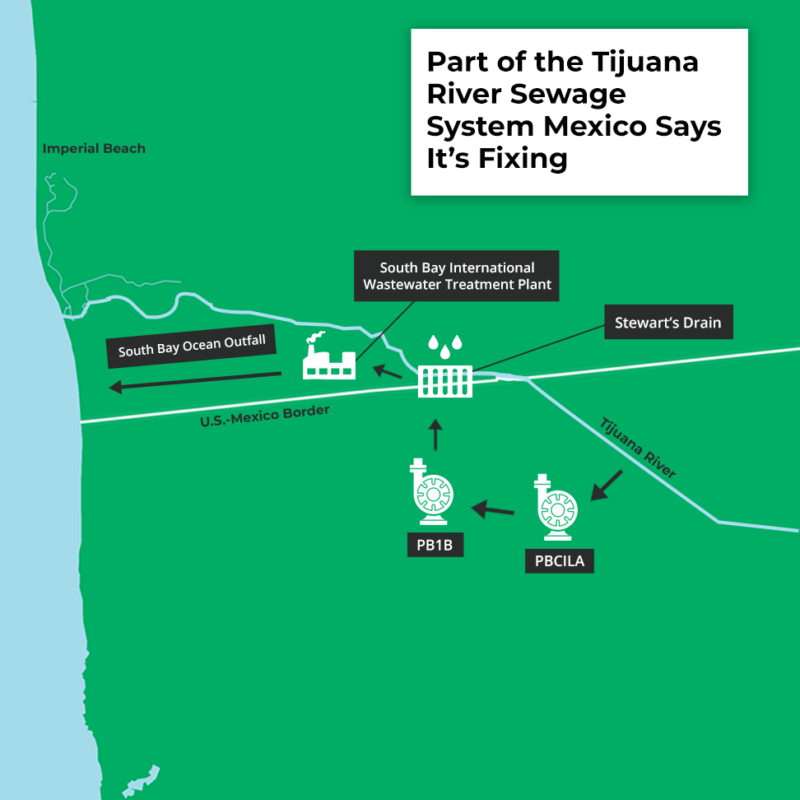 But now, the biggest problem seems to be a different broken piece of the Tijuana River diversion system, a pump called PB-1B, which sends river water and sewage from the larger pump station across the international border to the South Bay International Wastewater Treatment Plant. When there’s too much water for that pump to handle, it spills out of a drain in the border wall, bypassing the treatment plant and into the Tijuana River Valley.