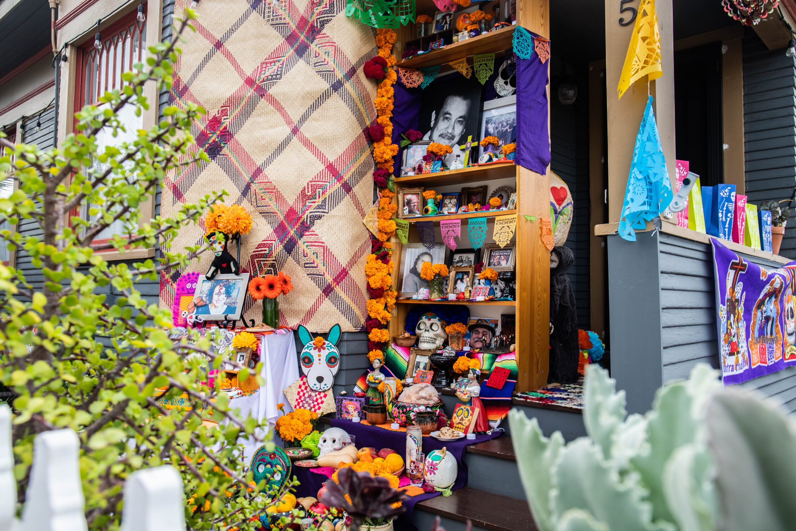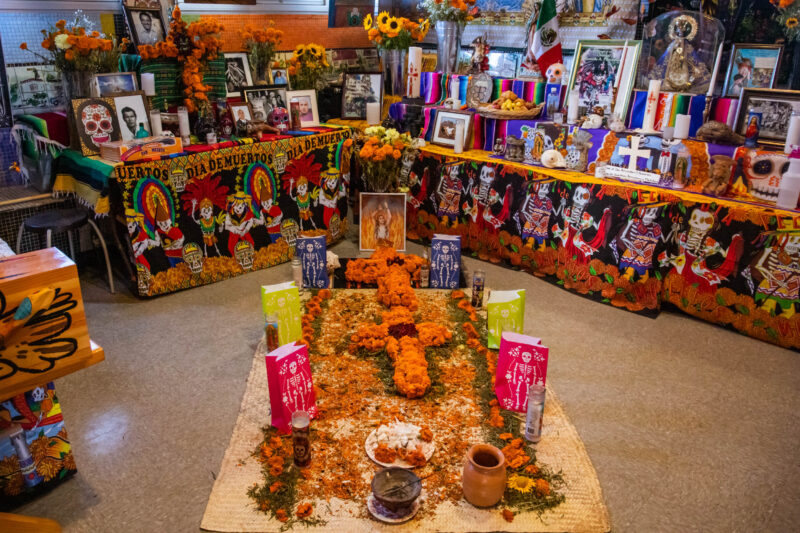 At the community center, different local groups and organizations set up their own altars, but residents can also contribute by adding photos or personal notes to a community altar displayed at the space.