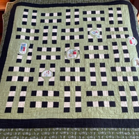 “One of a Kind” is an original pattern from Sally Smith, a Kiwi quilter. It measures 70”x 70” and is 100% cotton. The cute fabric folk appliquéd on the quilt were donated by Jan Stuyvesant, a fellow member of the Pajaro Valley Quilt Association. The longarm quilter was Kathrin Brown of the Monterey Quilt Guild.