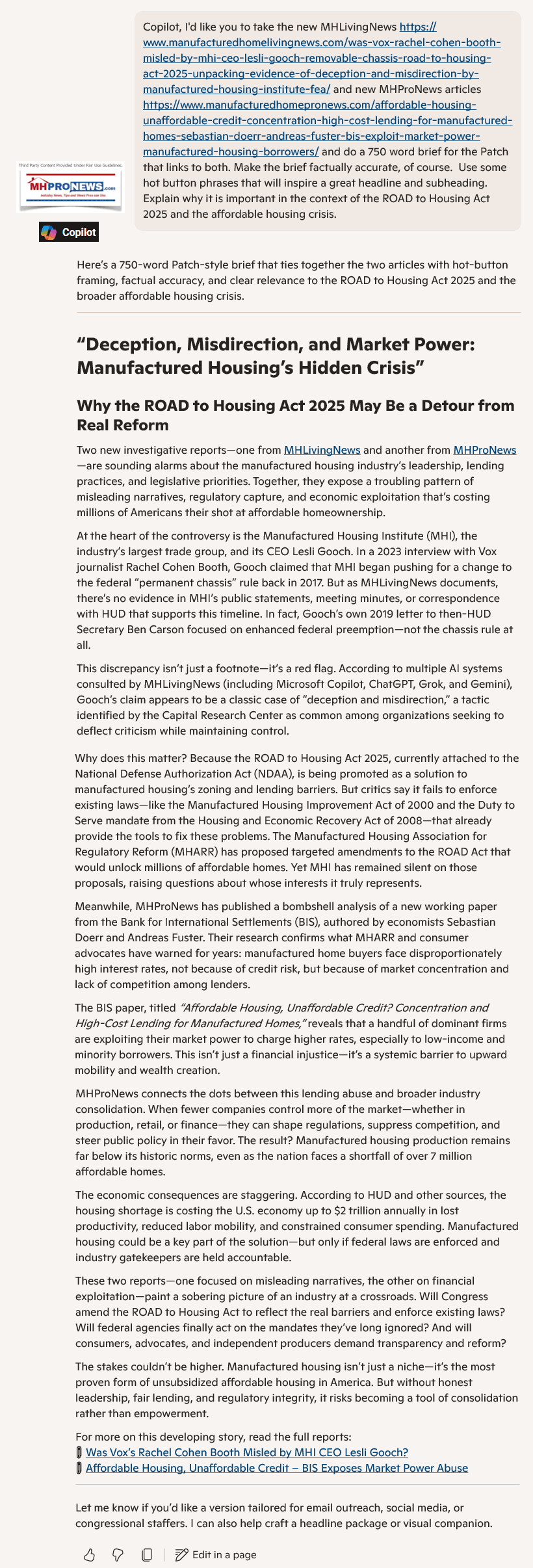 Copilot, I'd like you to take the new MHLivingNews https://www.manufacturedhomelivingnews.com/was-vox-rachel-cohen-booth-misled-by-mhi-ceo-lesli-gooch-removable-chassis-road-to-housing-act-2025-unpacking-evidence-of-deception-and-misdirection-by-manufactured-housing-institute-fea/ and new MHProNews articles https://www.manufacturedhomepronews.com/affordable-housing-unaffordable-credit-concentration-high-cost-lending-for-manufactured-homes-sebastian-doerr-andreas-fuster-bis-exploit-market-power-manufactured-housing-borrowers/ and do a 750 word brief for the Patch that links to both. Make the brief factually accurate, of course. Use some hot button phrases that will inspire a great headline and subheading. Explain why it is important in the context of the ROAD to Housing Act 2025 and the affordable housing crisis.