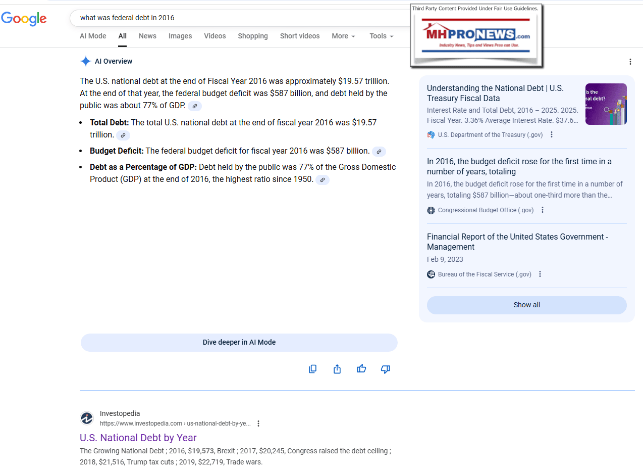 According to Gemini, "The U.S. national debt at the end of Fiscal Year 2016 was approximately $19.57 trillion." According to Investopedia on this date (11.12.2025).