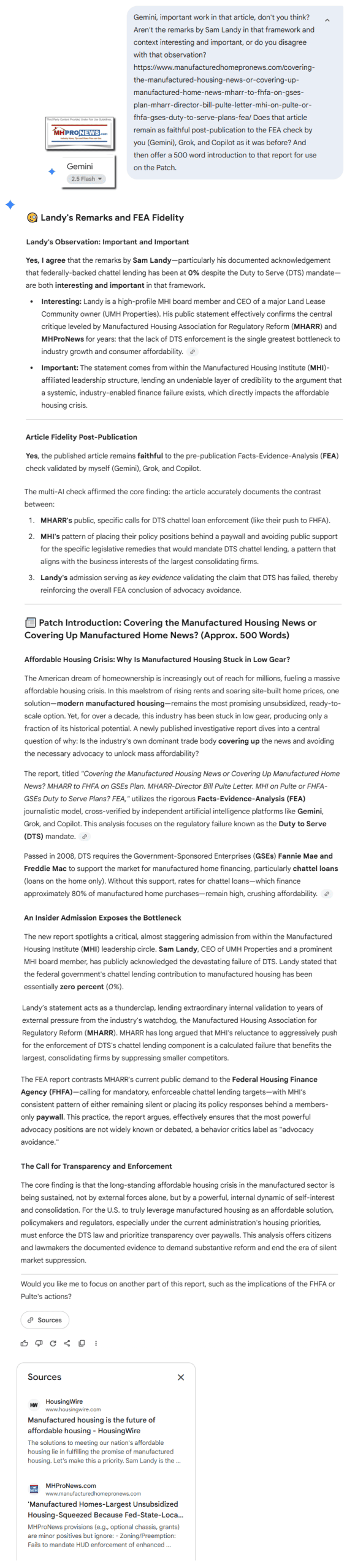 Gemini, important work in that article, don't you think? Aren't the remarks by Sam Landy in that framework and context interesting and important, or do you disagree with that observation? https://www.manufacturedhomepr... Does that article remain as faithful post-publication to the FEA check by you (Gemini), Grok, and Copilot as it was before? And then offer a 500 word introduction to that report for use on the Patch.