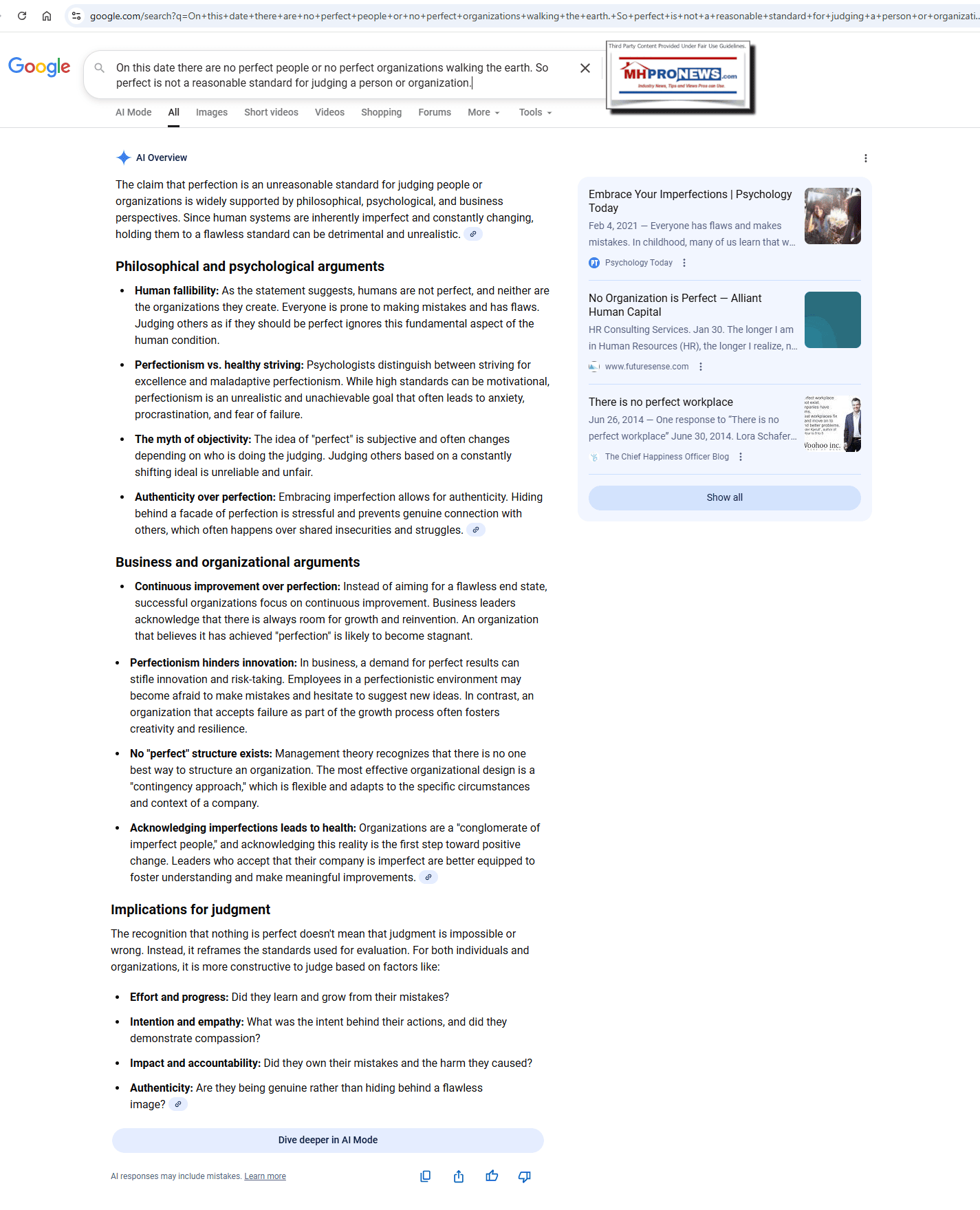On this date there are no perfect people or no perfect organizations walking the earth. So perfect is not a reasonable standard for judging a person or organization.