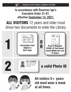 In accordance with Governor Ige’s Executive Order No. 21-07, all visitors 12 years and older must show proof of vaccination or negative COVID-19 test results issued within the last 72 hours to enter any public library or support offices.