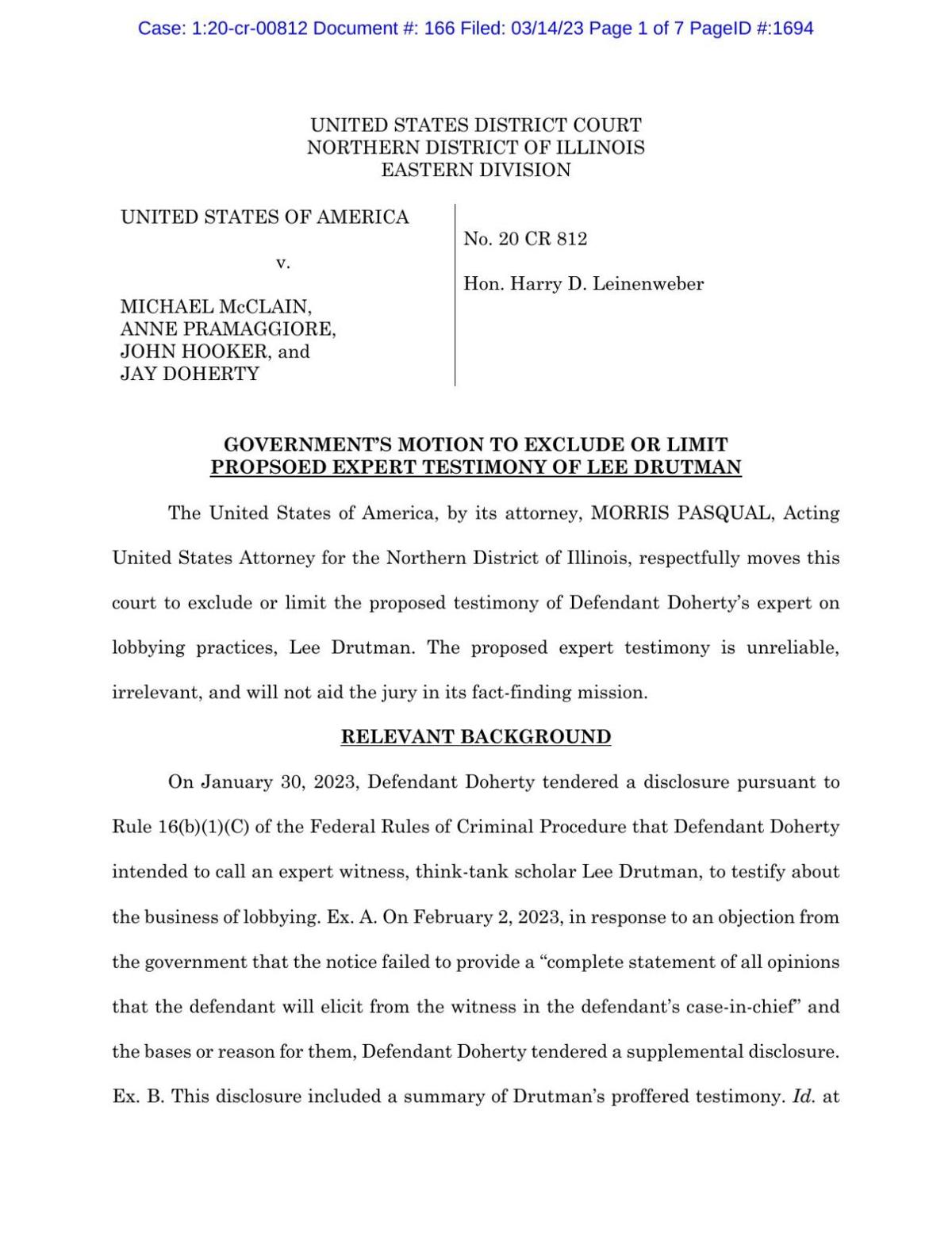"The focus of Drutman's proposed testimony – the basics of lobbying – resembles the principles taught in a high school civics class," prosecutors argued in a motion that seeks to exclude or limit the testimony. "The jury will be familiar with the general notion of how a bill becomes a law and how various political and non-political actors influence that process based on the government’s fact witnesses, which will include current and former legislators and lobbyists."