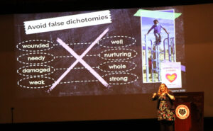 Schwartz spoke about preserving and responding to the need for equity in the classroom. For Schwartz, this starts with recognizing that all students have stories, desires, fears, and strengths unique to them that they are just waiting to tell.
