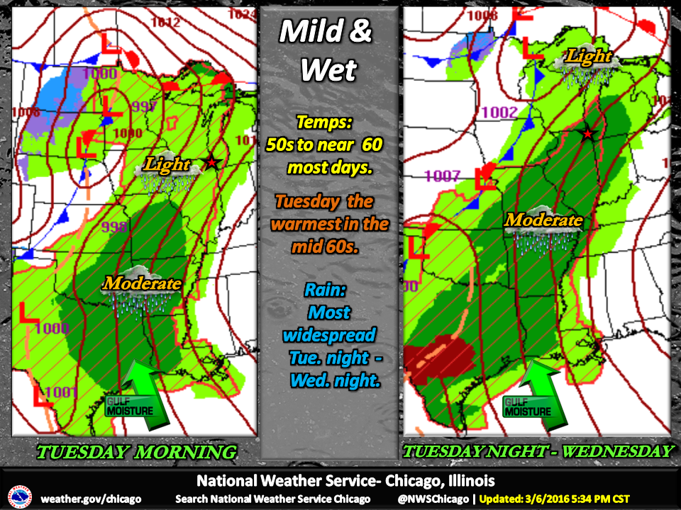 A wet and mild forecast for the week ahead. Thunderstorms possible Tuesday and Wednesday.