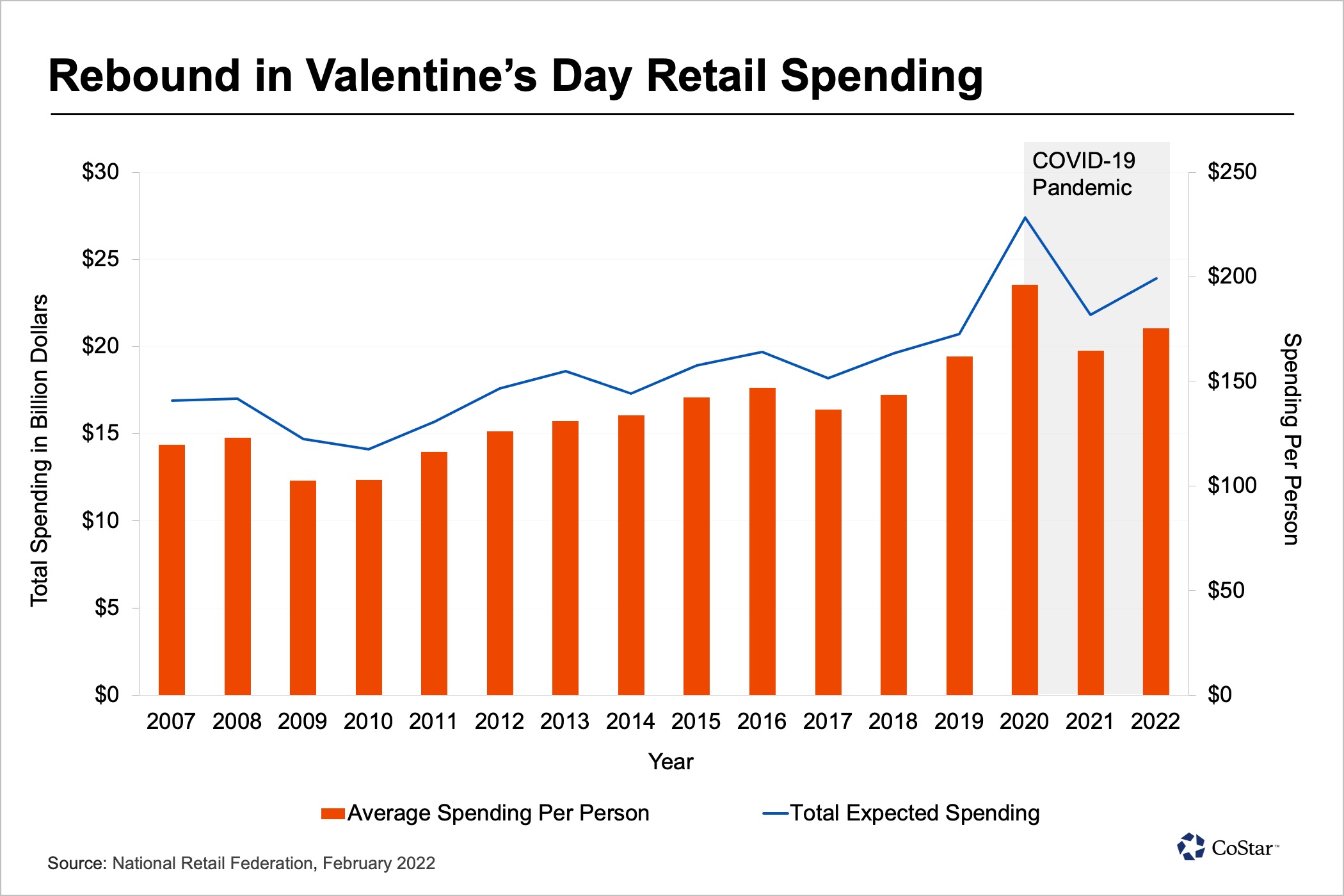 Valentine’s Day spending is projected to reach $23.9 billion this year, up from $21.8 billion in 2021, marking the second-highest year on record, according to the annual survey released by the National Retail Federation and Prosper Insights & Analytics.