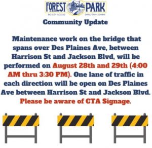 Single Lane Closure Notice! This Weekend (Sat. 8/28 and Sun. 8/29 from 4AM to 3:30PM) CTA will be performing maintenance work upon their bridge over Des Plaines Ave. between Harrison & Jackson Blvd.
