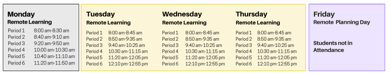 This week’s schedule is below. As a reminder, Friday, October 23 is a Remote Planning Day and students do not participate in remote learning. Students should use this extra time to complete assignments, projects, and/or study.