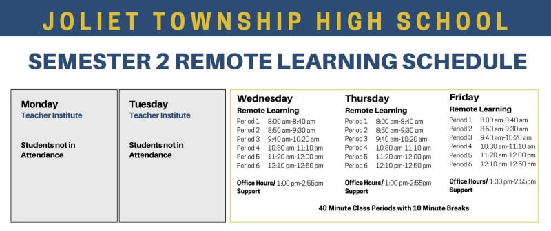 Semester 2 remote classes follow a new schedule, with 40-minute class periods and 10 minutes in between each class.