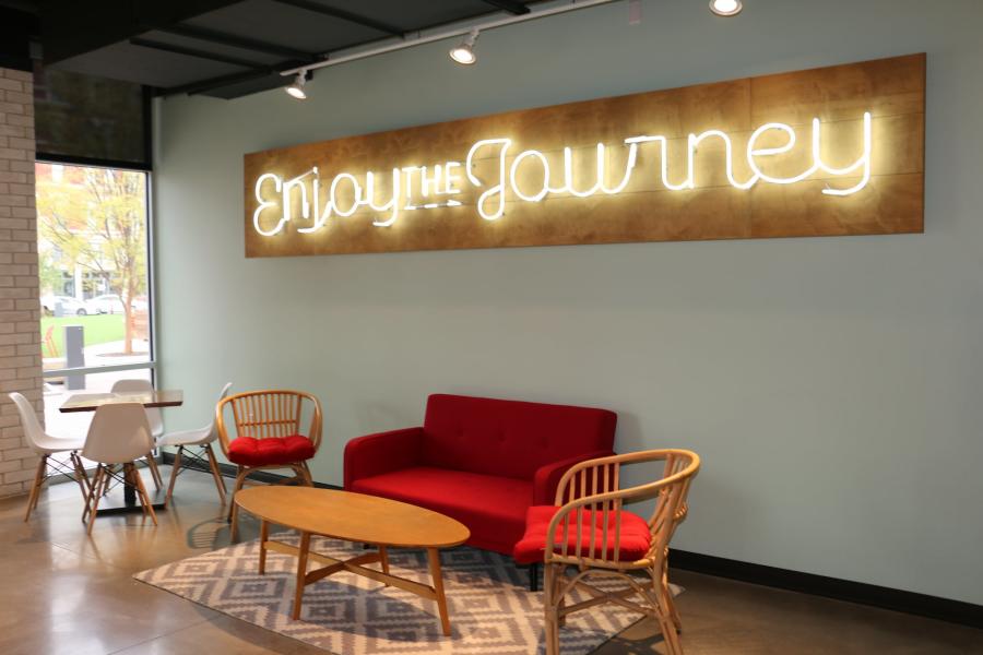 C’mon, what’s not to love about a café dedicated to pie? Besides the mouthwatering smells and beautiful dessert case at Peace, Love & Pie, the modern interior of this new space will help you Enjoy the Journey as you enjoy a slice of pie, a pie shake or one of their perfectly-sized Cutie Pies.