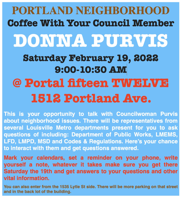Louisville – Councilwoman Donna Purvis (D-5) is inviting the Portland neighborhood to join her for this month’s ‘Coffee with your Councilwoman’ event on Saturday, February 19.