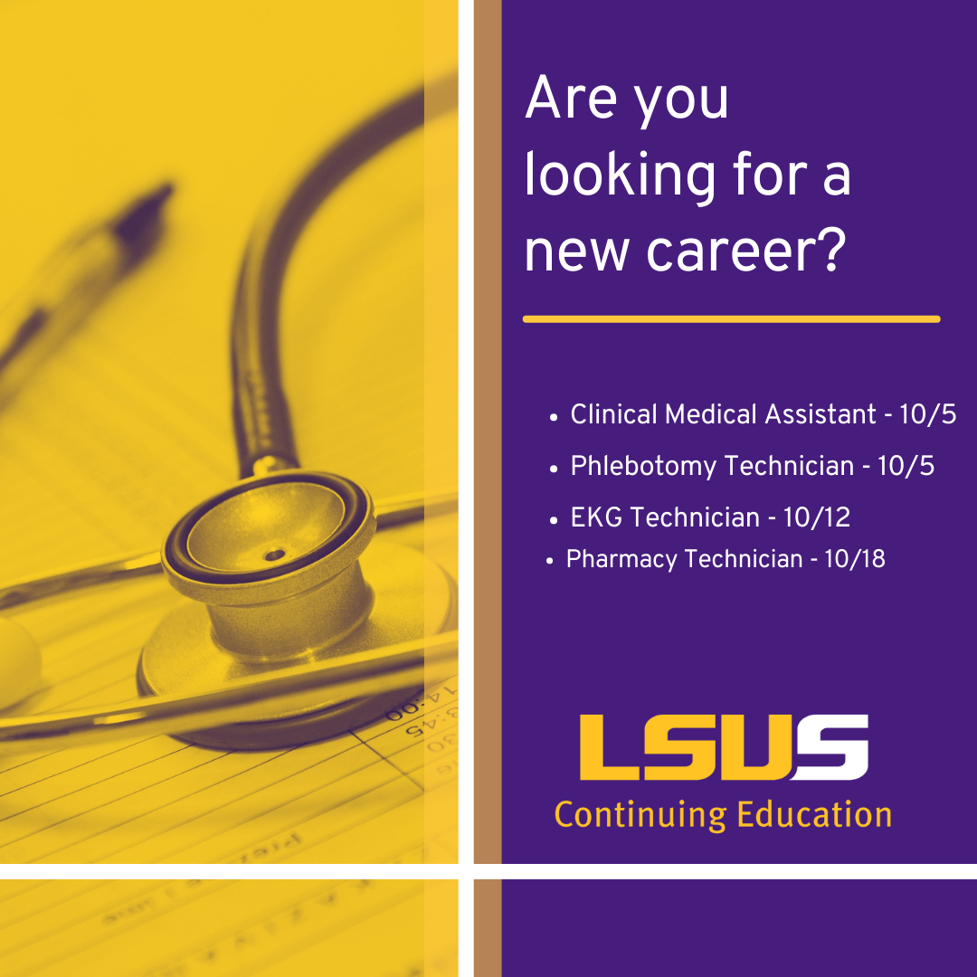 Clinical Medical Assistant Program – with Clinical Externship This program will train students to assist physicians by performing functions related to the clinical responsibilities of a medical office. Instruction includes: 140 hours of classroom lecture, hands-on labs, and a clinical externship opportunity at a local healthcare provider. Start Date: Tuesday, October 5, 2021. Time: 6:00 p.m. – 9:30 p.m. Price: Register by Wednesday, September 29, 2021 to get the early bird fee of $2,799.00. After that date, the cost will be $2,899.00. Students may sign up at: https://www.ce.lsus.edu/courseDisplay.cfm?schID=6818