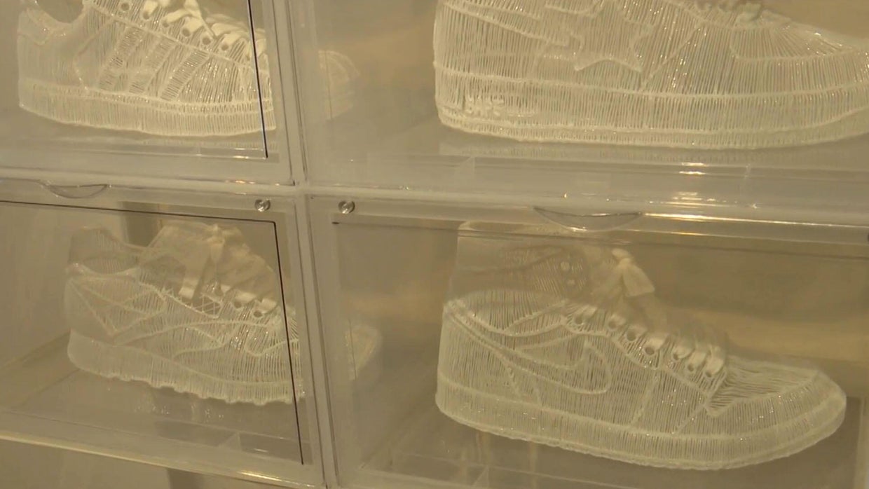 3D-printed sneakers are included in the MassArt Art Museum's Future Fossils exhibit/CBS Boston