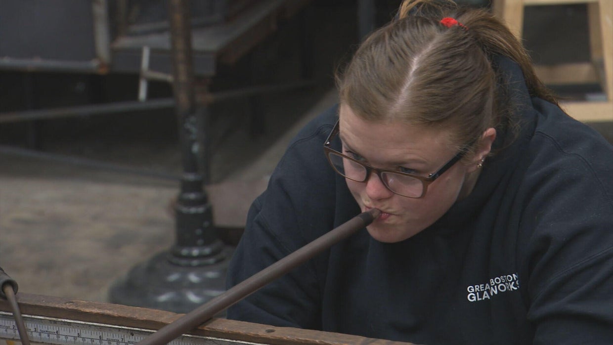 Kat Kaufman blows through a tube to make blown glass at the NOCA Glass School in North Cambridge, Massachusetts/CBS Boston