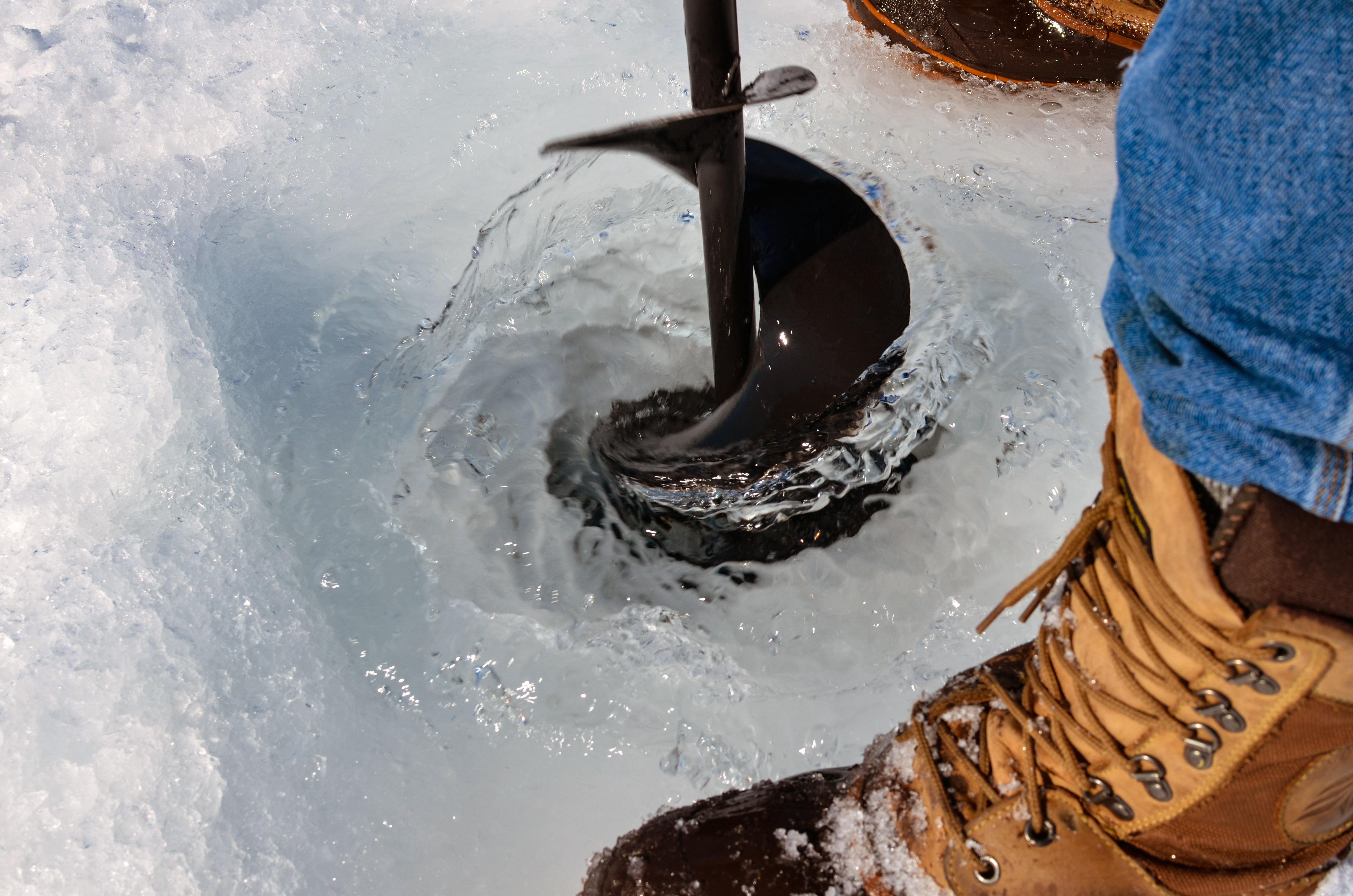 Angler: An ice angler uses an auger to cut a hole through the ice on Lake Superior./