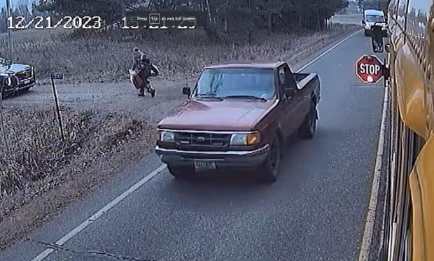 Video footage from the school bus shows a motorist in a 1994 Ford Ranger pass a van on the shoulder before driving past a school bus with its stop sign out. A couple of students were exiting at the time, and one had to run to get out of the way of the truck.