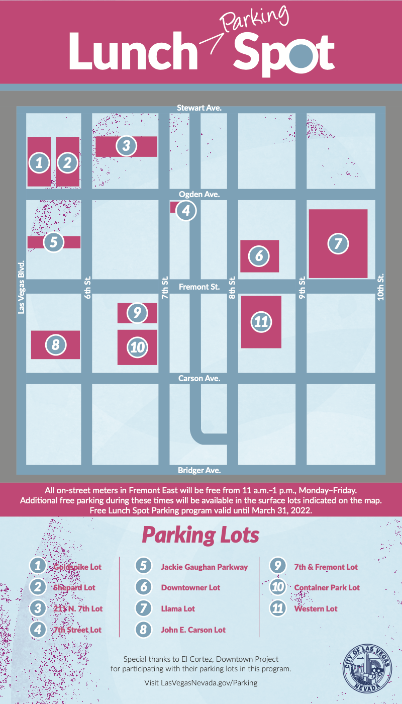 We're offering free parking Monday-Friday, 11 a.m. to 1 p.m., in downtown Las Vegas to allow residents and visitors to explore the many new and continuing restaurants!