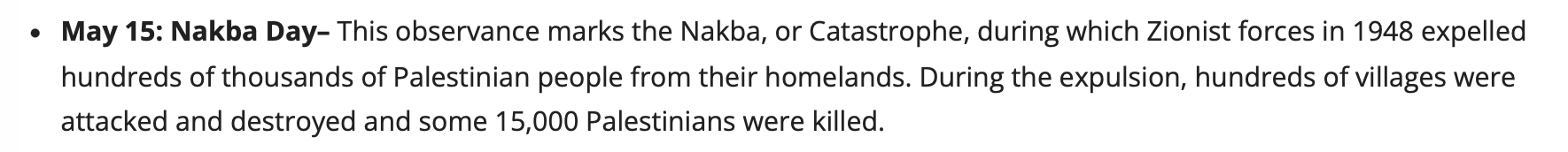 According to the City of Concord’s “Diversity & Inclusion Calendar” for 2024, “This observance marks the Nakba, or Catastrophe, during which Zionist forces in 1948 expelled hundreds of thousands of Palestinian people from their homelands. During the expulsion, hundreds of villages were attacked and destroyed and 15,000 Palestinians were killed.”