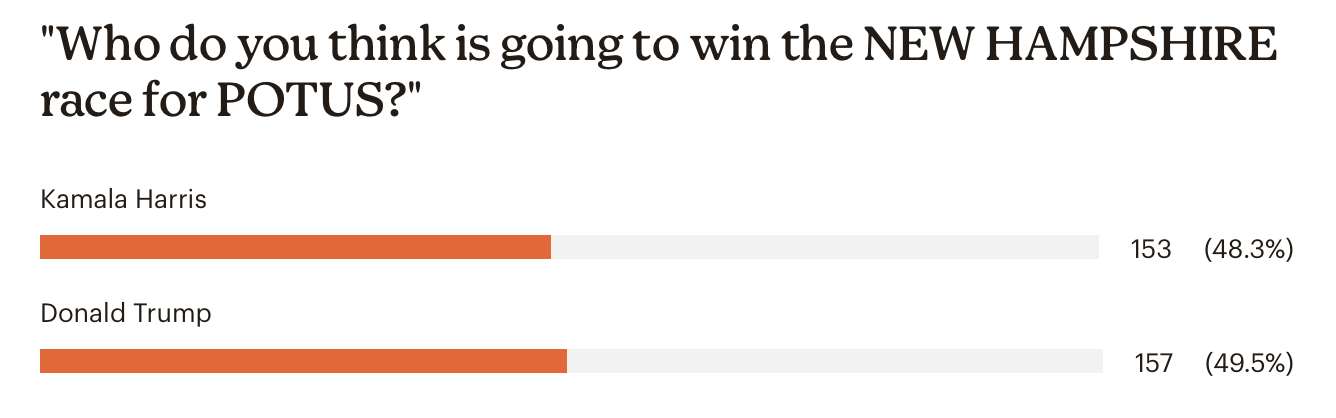 But when asked which of the two will carry New Hampshire on Tuesday, the respondents were evenly split: 50 percent said Trump, 48 percent Harris.