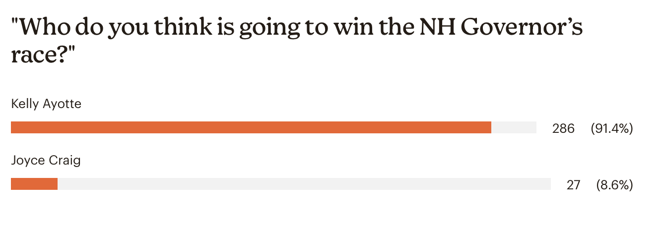 Where the readers are in overwhelming agreement: Predicting Republican Kelly Ayotte will beat Democrat Joyce Craig in the governor’s race. More than 90 percent predicted Ayotte, while just 8 percent picked Craig. Recent polling gives Ayotte about a four-point advantage over her Democratic opponent.