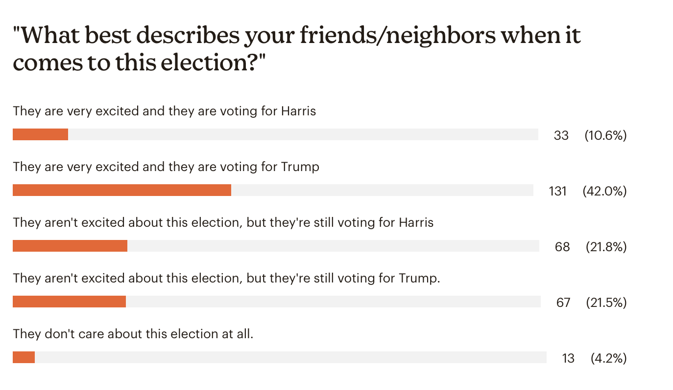 NHJournal also asked readers how their neighbors view this election. The top answer is that, like the readers, their neighbors are voting for Trump and are excited to do so, though it’s just 42 percent. Another 22 percent said their neighbors are voting for Trump, but they aren’t thrilled about it.