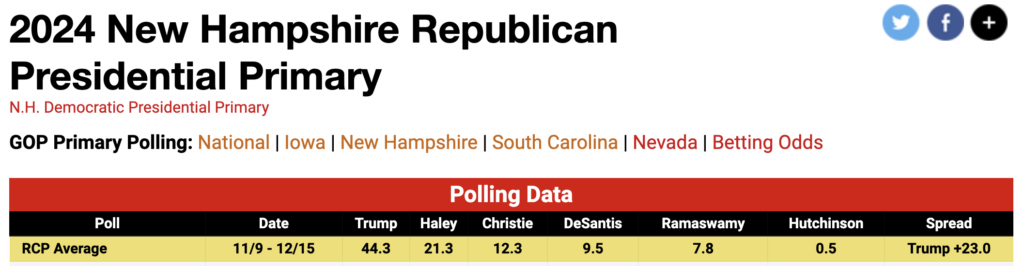 A CBS News poll released Sunday put Haley at 29 percent, 15 points behind Trump at 44 percent. It was the first RCP poll this year to give Trump less than a 20-point lead in the Granite State.