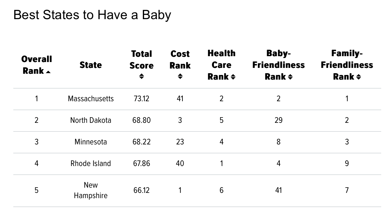 “The best states for having a baby minimize costs while providing top-notch care for both newborns and their mothers,” said Cassandra Happe, an analyst for Wallethub. “They also continue to be good environments for parents even long after the birth, with high-quality pediatric care, affordable and accessible child care, and a strong economic environment that makes providing for a child easier.”
