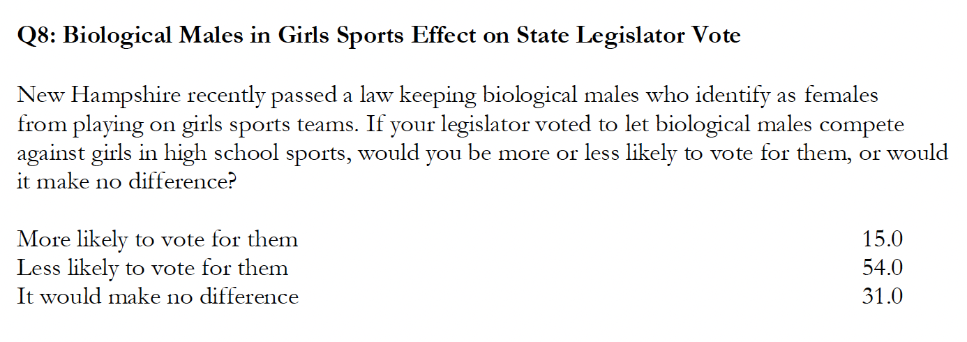 In New Hampshire, the new NHJournal/Praecones Analytica poll asked if voters would be more or less likely to support a legislator who voted to allow males who identify as female to play on girls sports teams. Only 15 percent said “more likely,” while 54 percent said “less likely” — more than three times more favorable for the GOP.