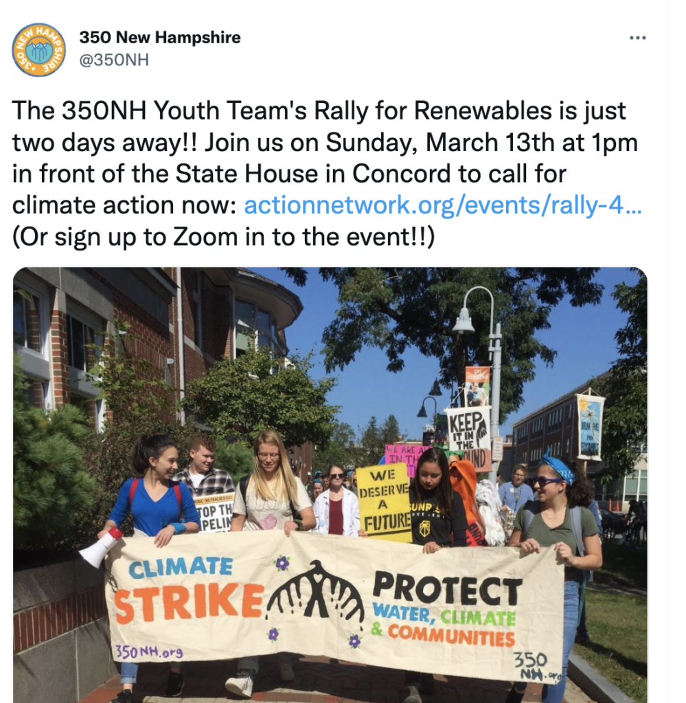 New Hampshire’s 350 Action organization will be hosting a “Rally for Renewables” on Sunday, but they aren’t expecting Sen. Maggie Hassan or Rep. Chris Pappas to make an appearance.