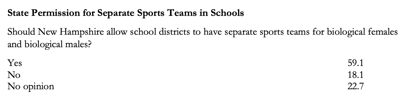 A solid majority of Granite Staters (59 percent) say schools should be allowed to have separate sports teams for biological females and biological males, while just 18 percent disagree. A bill protecting girls-only sports from biological males in middle and high school passed the New Hampshire legislature over the objection of virtually every Democrat and is now headed to Gov. Chris Sununu’s desk.