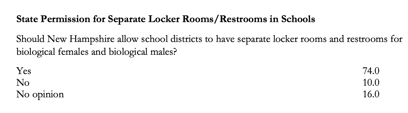 While state Senate Democrats were unanimously voting against allowing schools to have separate locker rooms and restrooms for biological females and males on Wednesday, a new poll showed 74 percent of Granite Staters support the idea.