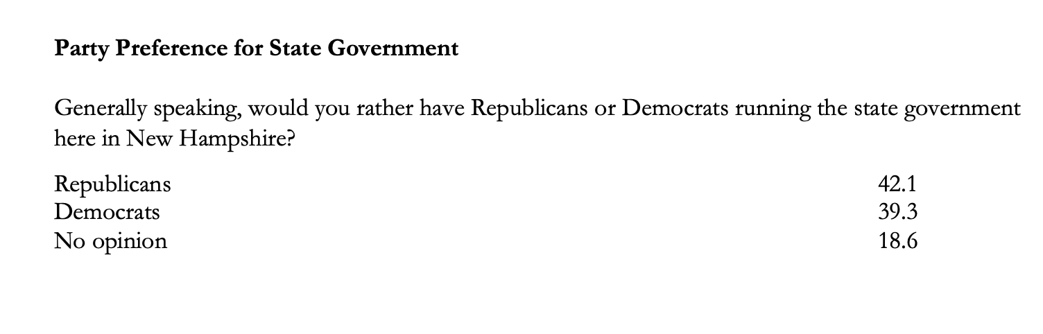 Asked who they want running the state government in Concord, voters give Republicans a narrow 42-39 percent edge.