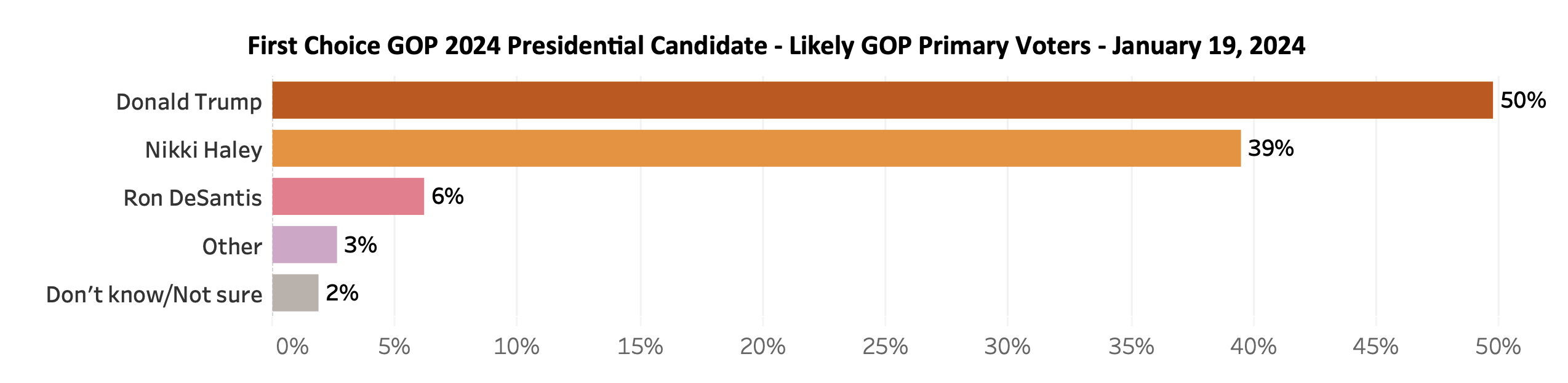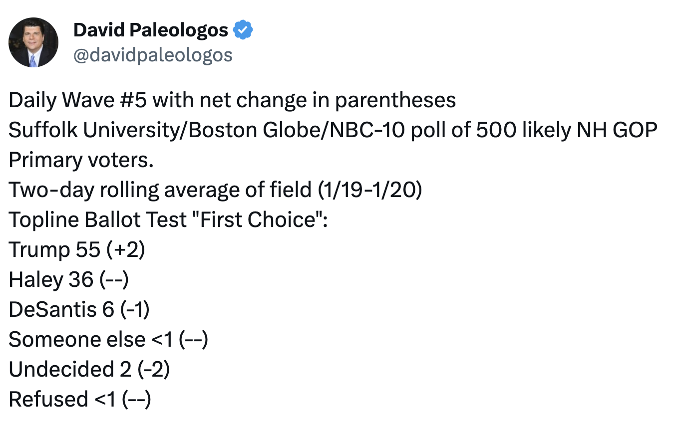 The Suffolk University/Boston Globe/NBC-10 poll of 500 likely NH GOP Primary voters on Wednesday (January 17) was Trump at 50 percent, Haley at 34 percent, and DeSantis at 5 percent.