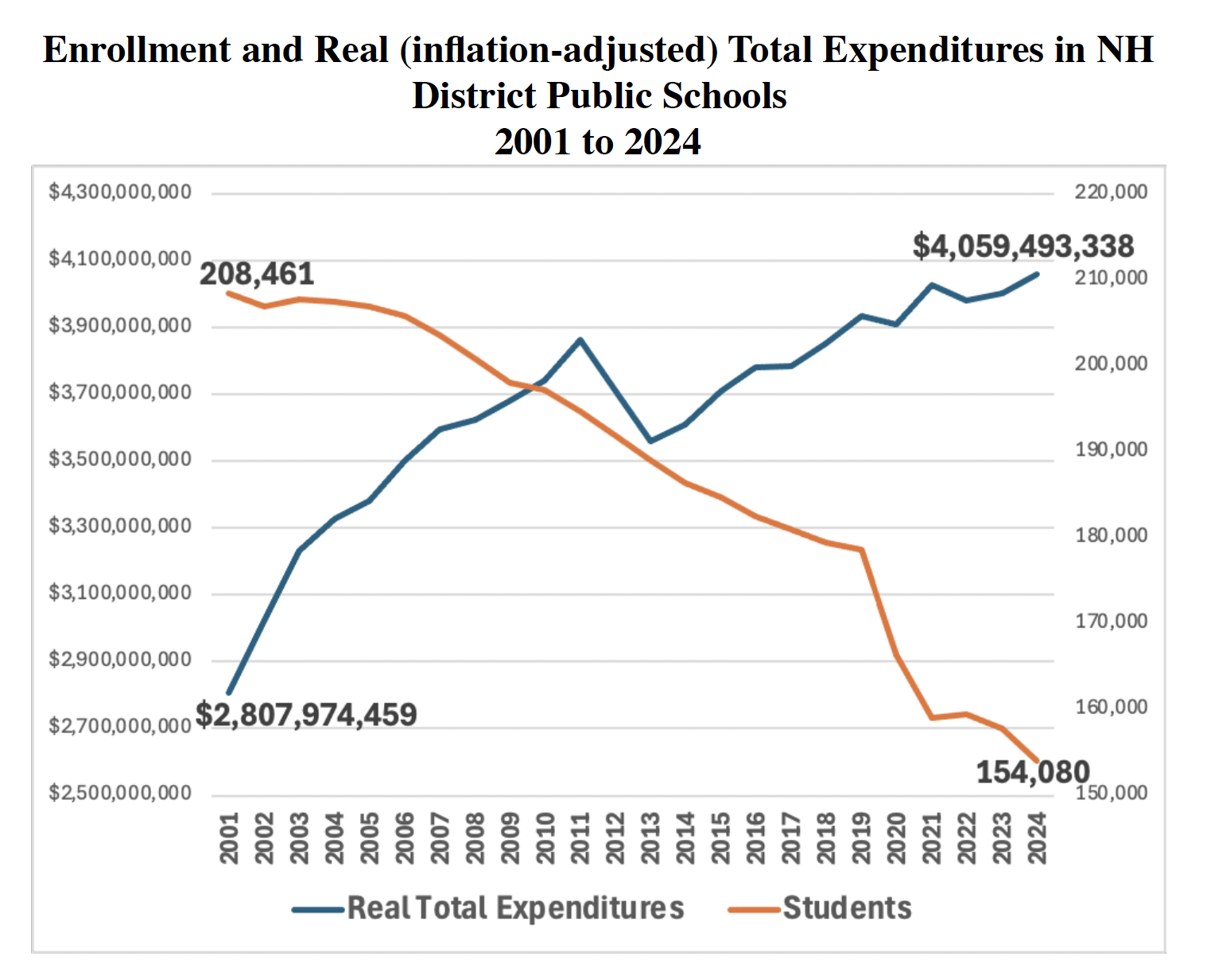 Adjusted for inflation, total public school district spending increased by $1.25 billion, or 45 percent, between 2001 and 2024.