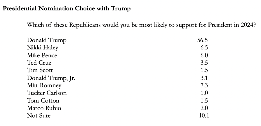 “I would hesitate to draw anything meaningful from these numbers. It would not surprise me if the eventual winner of the ‘24 primary is not even included in these choices. Does Trump still hold his block of voters? Sure he does. But will that be a plus or a minus in 2024? No one knows.”