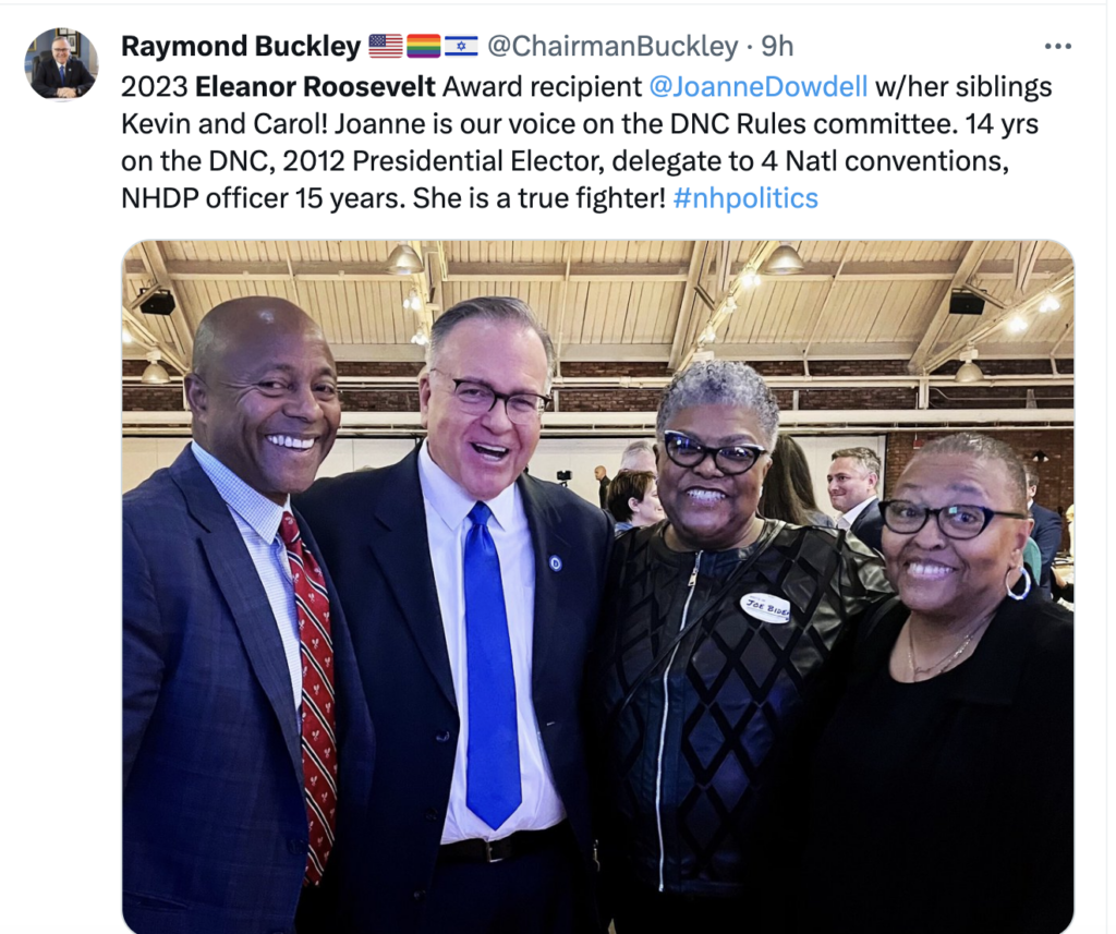They gave the 2023 Eleanor Roosevelt Award Friday night to Joanne Dowdell — the woman who literally lost the First in the Nation primary for New Hampshire. She was, as Buckley put it, “our voice on the DNC Rules Committee” when the DNC took the state’s FITN status.