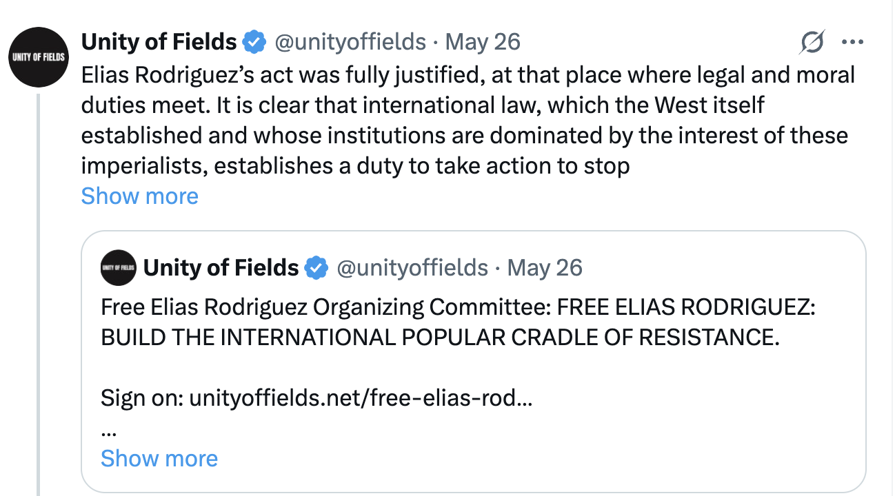 When radical leftist Elias Rodriguez murdered Israeli embassy staffers Yaron Lischinsky and Sarah Milgrim on May 22 in Washington, D.C., the group Unity of Fields went to work.