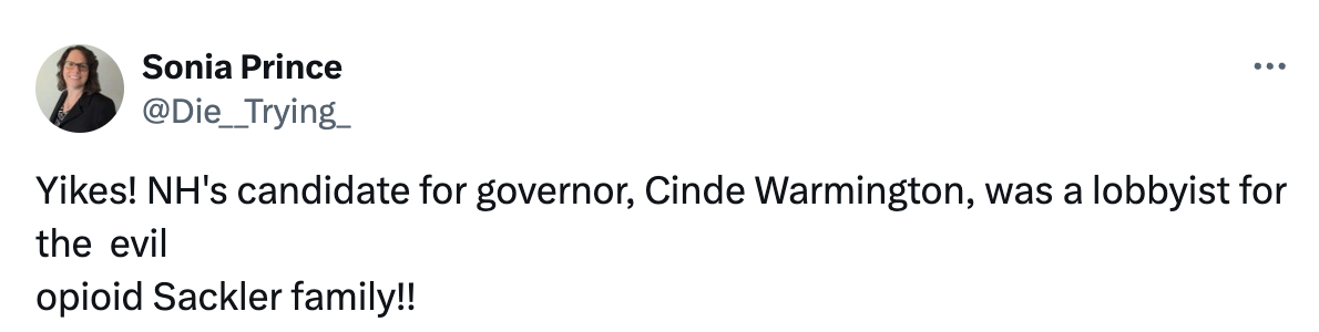 In another post, Prince writes: “Candidate for NH Gov, Cinde Warmington, is a former lobbyist for the Perdue opioid company and praised the evil Sackler’s family addictive and deadly products.”