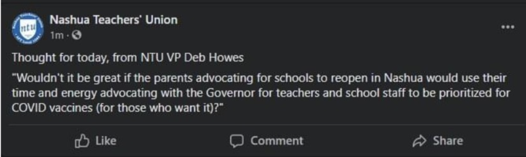 “Wouldn’t it be great if the parents advocating for schools to reopen in Nashua would use their time and energy advocating with the Governor for teachers and school staff to be prioritized for COVID vaccines (for those who want it)?”