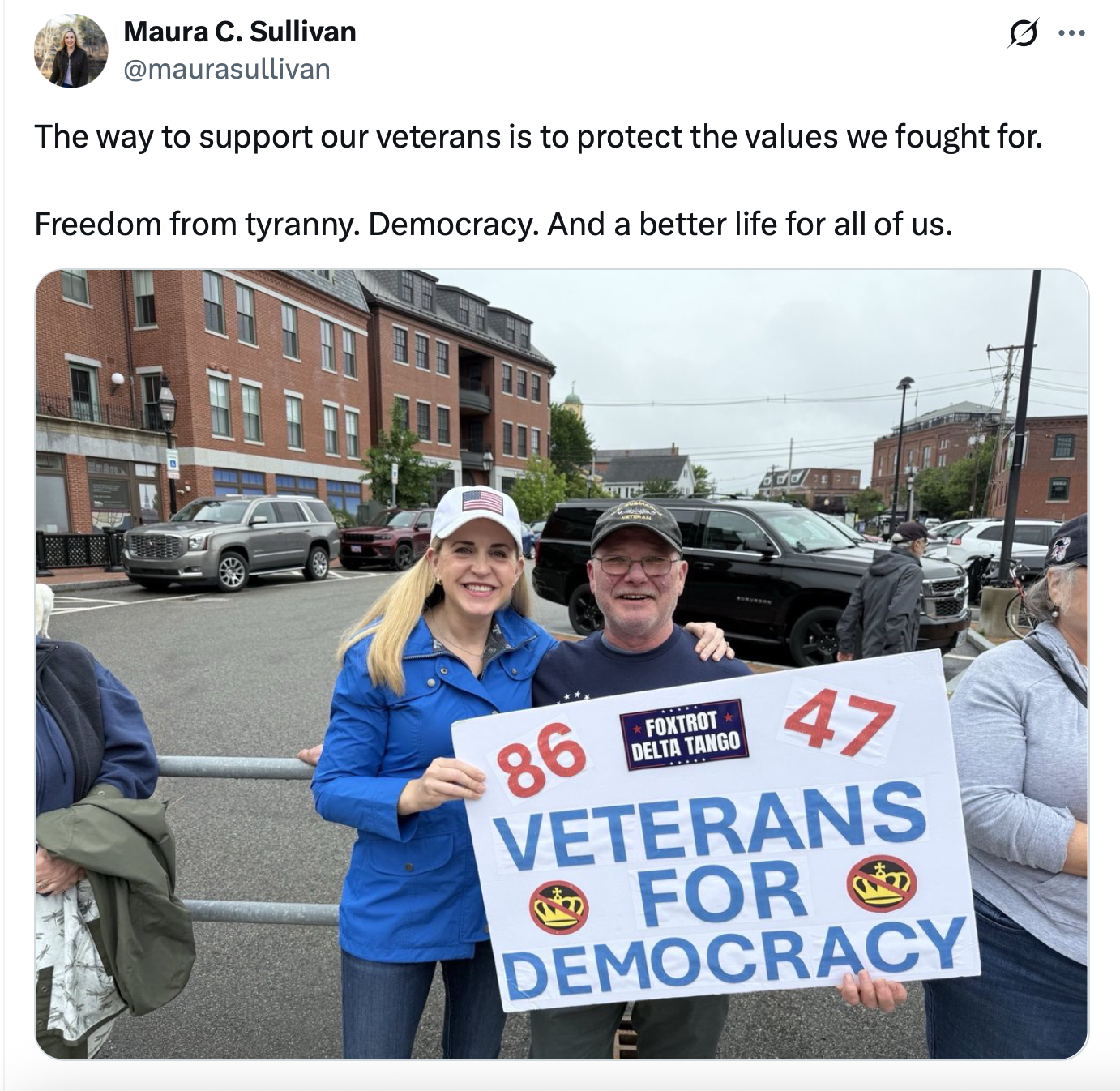 Sullivan spoke at the Portsmouth “No Kings” event, where she took a few minutes to pose for a photo with a fellow protester. His sign read “Veterans for Democracy,” a good fit for Marine veteran Sullivan, who served in the Obama administration’s Department of Veterans Affairs.