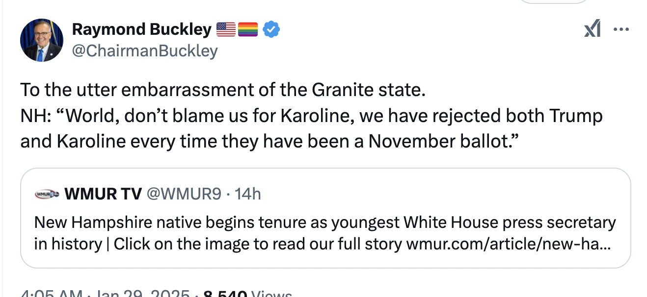 Responding to a Twitter/X post from WMUR reporting on Leavitt’s starting her new job, Buckley wrote, “To the utter embarrassment of the Granite State.”