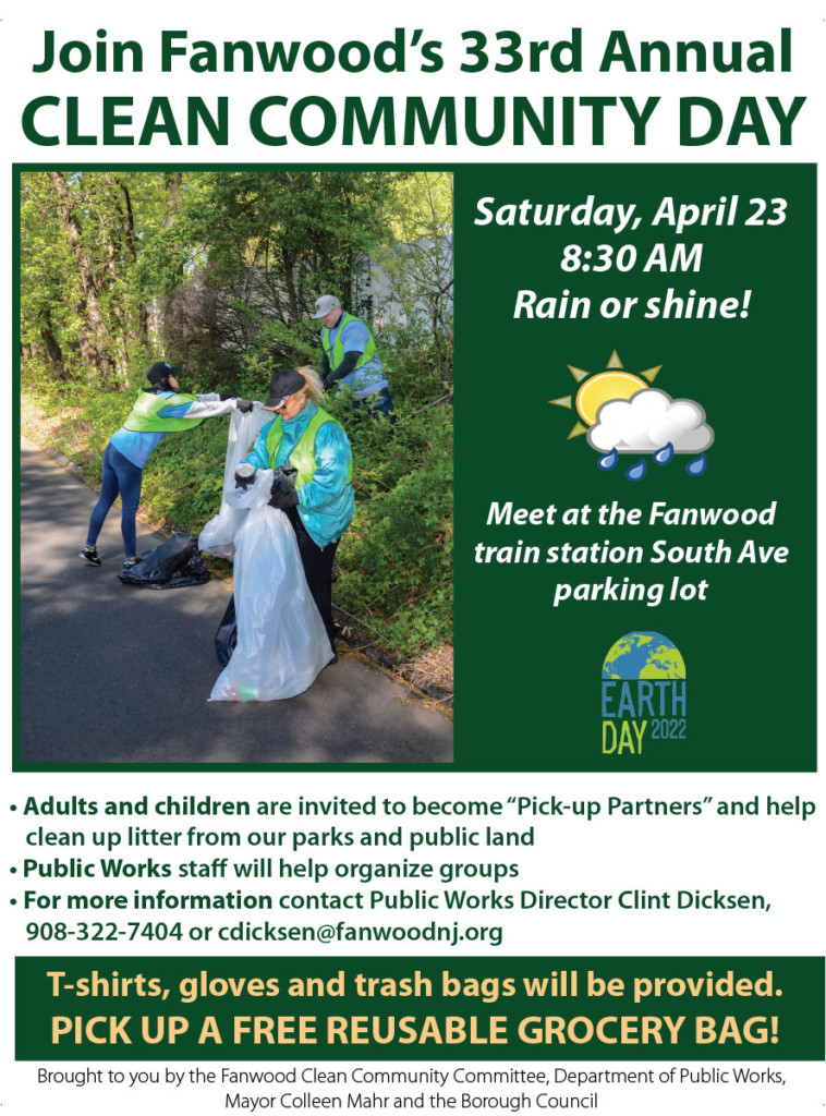 Our Earth Day celebration of a clean community is back Saturday, April 23rd! Volunteer to pick up trash around Fanwood under the guidance of our Public Works professionals.