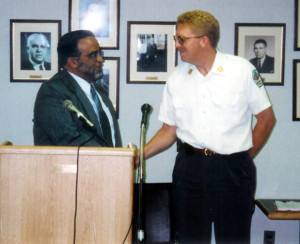 As Council President in 1999 presenting proclamation to Rescue Squad Captain Jeffrey Downing for the squad’s service to Bound Brook following Tropical Storm Floyd